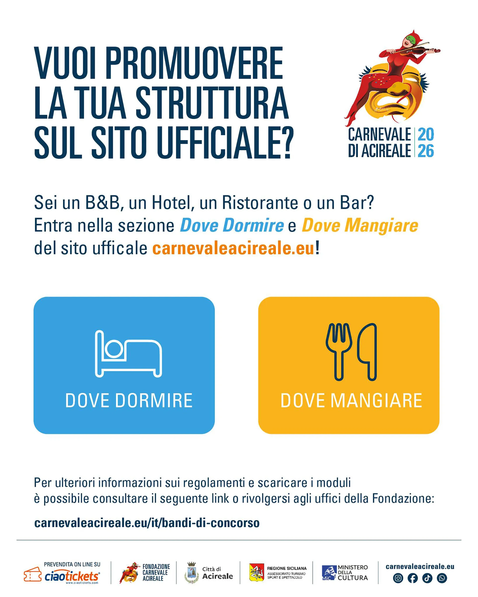 La Fondazione Carnevale di Acireale apre ufficialmente la possibilità di partecipare al nuovo avviso pubblico dedicato all’inserimento di spazi pubblicitari nella sezione “Dove Dormire e Dove Mangiare” del sito ufficiale del Carnevale di Acireale 2026.