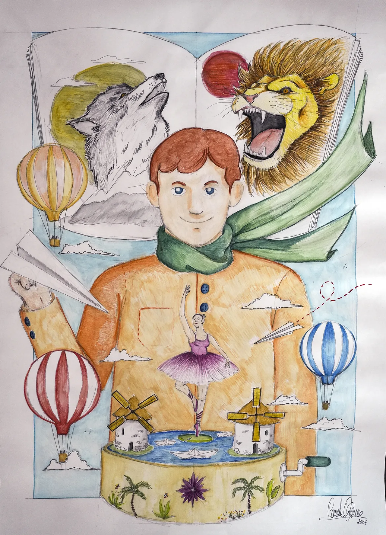Ispirato al brano di Vecchioni, l’omaggio alla giovinezza e alla libertà di immaginare. Un ragazzo guarda il cielo con un aquilone, simbolo di aspirazioni che volano oltre i confini. Attorno, figure adulte tentano di trattenerlo, ma i fiori che si sollevano al suo passaggio diventano promesse di futuro. Un invito a credere nei propri ideali e a non arrendersi al disincanto: il sogno è il primo passo verso ogni rinascita.