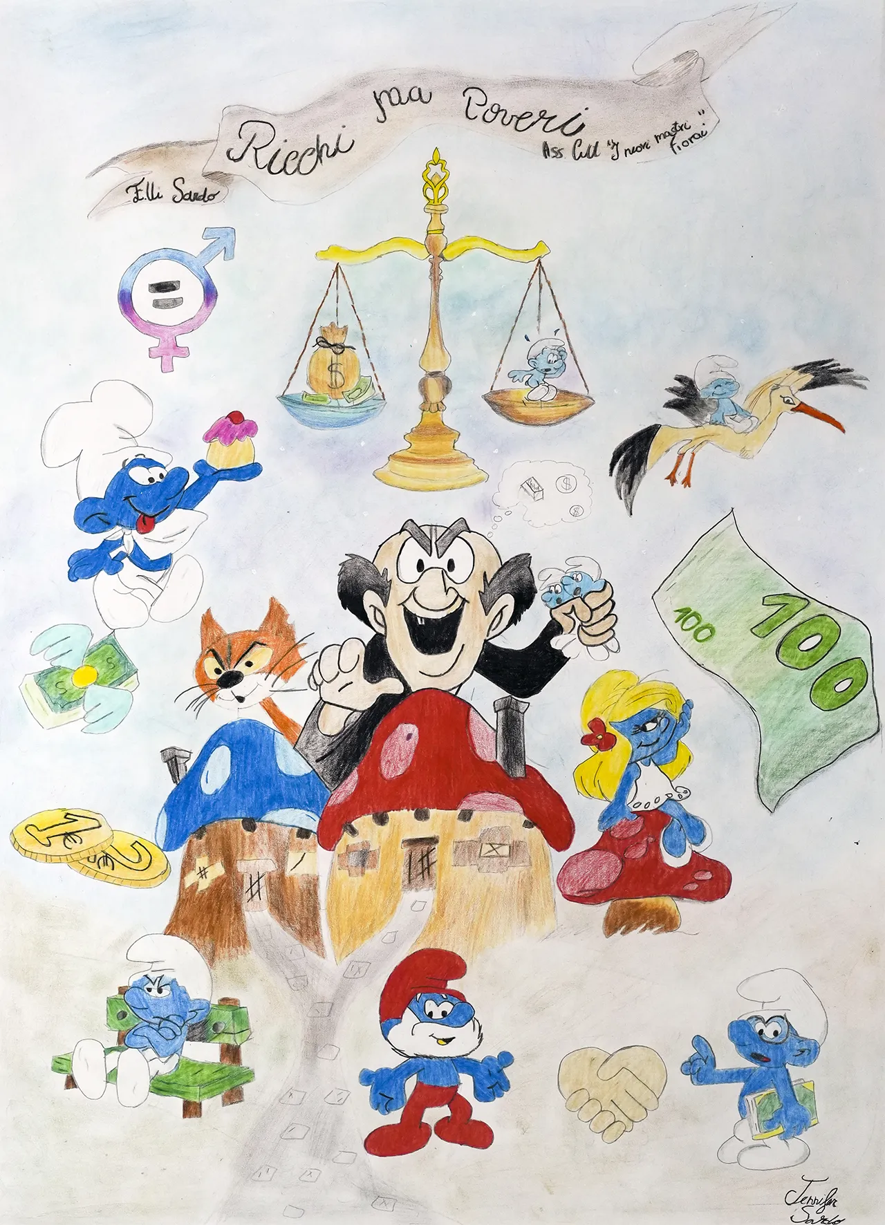 Una satira sul paradosso del nostro tempo: possesso senza pienezza. Figure eleganti sfilano tra ricchezze, ignare della loro povertà interiore. Oro e fiori si intrecciano svelando la fragilità dietro il lusso. Al centro, un bambino con un fiore ricorda che il vero tesoro è amare e condividere. Una riflessione dolce e amara sull’essenza della felicità e sul valore delle piccole cose.